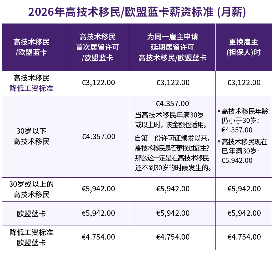 ◎ 30 周岁及以上高技术移民:税前月薪 5942 欧元(不含8%假期津贴),较2025年上调254 欧元,折合人民币约5万元/月。