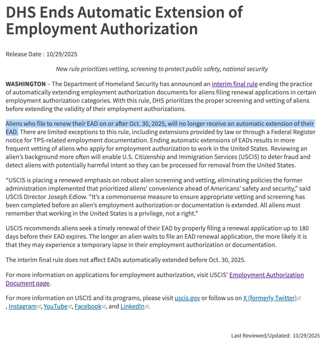 美国国土安全部(DHS)于10月16日正式在联邦公告网上公布,即日起对部分移民假释(Immigration Parole)申请加收1000美元的费用。发布时间:2025年10月22日 14:35 -