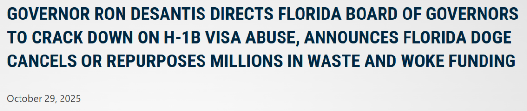 2025年10月,佛州州长罗恩·德桑蒂斯下令州立大学全面停止雇用H1-B签证持有者,声称优先保障本土就业。该指令适用于佛罗里达州立大学系统内的12所大学,包括南佛罗里达大学、佛罗里达大学、佛罗里达州立大学、中佛罗里达大学和佛罗里达国际大学等。