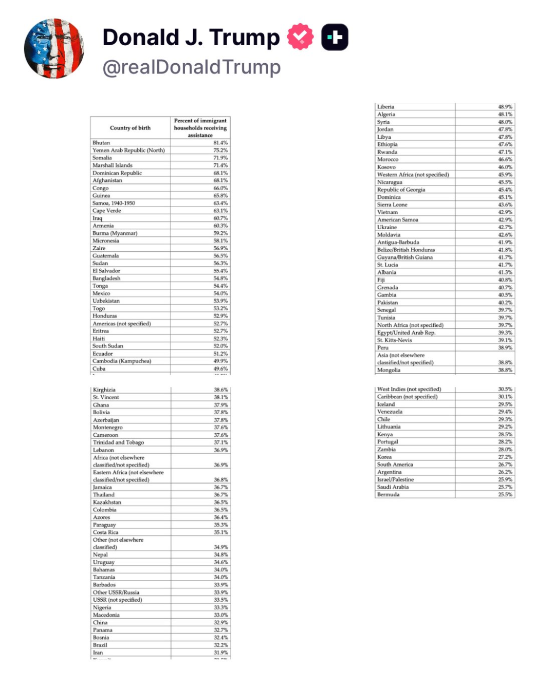 据报道,美国总统特朗普在社交媒体平台Truth Social上分享了一份图表——《按原籍国划分的移民福利领取率》,里面包含全球120个国家移民家庭在美国领取福利和公共援助的比例。其中,中国32.9%的华裔移民家庭被标注“领取政府援助”。