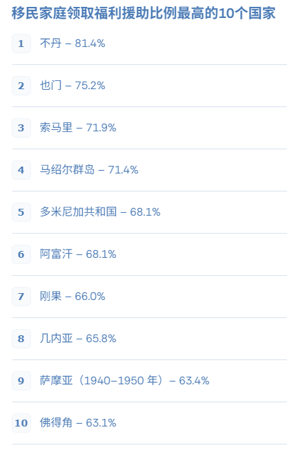 中国移民家庭的领取比例为32.9%,排在前列;乌克兰移民家庭的比例也不低,达到42.7%。此外,未明确分类的“亚洲其他地区”移民,福利领取率高达38.8%。