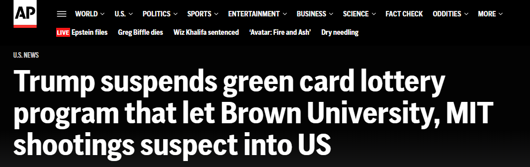 特朗普政府宣布暂停美国绿卡抽签项目,称布朗大学枪击案中杀害麻省理工学院教授的嫌疑人正是通过该项目获得美国绿卡。
