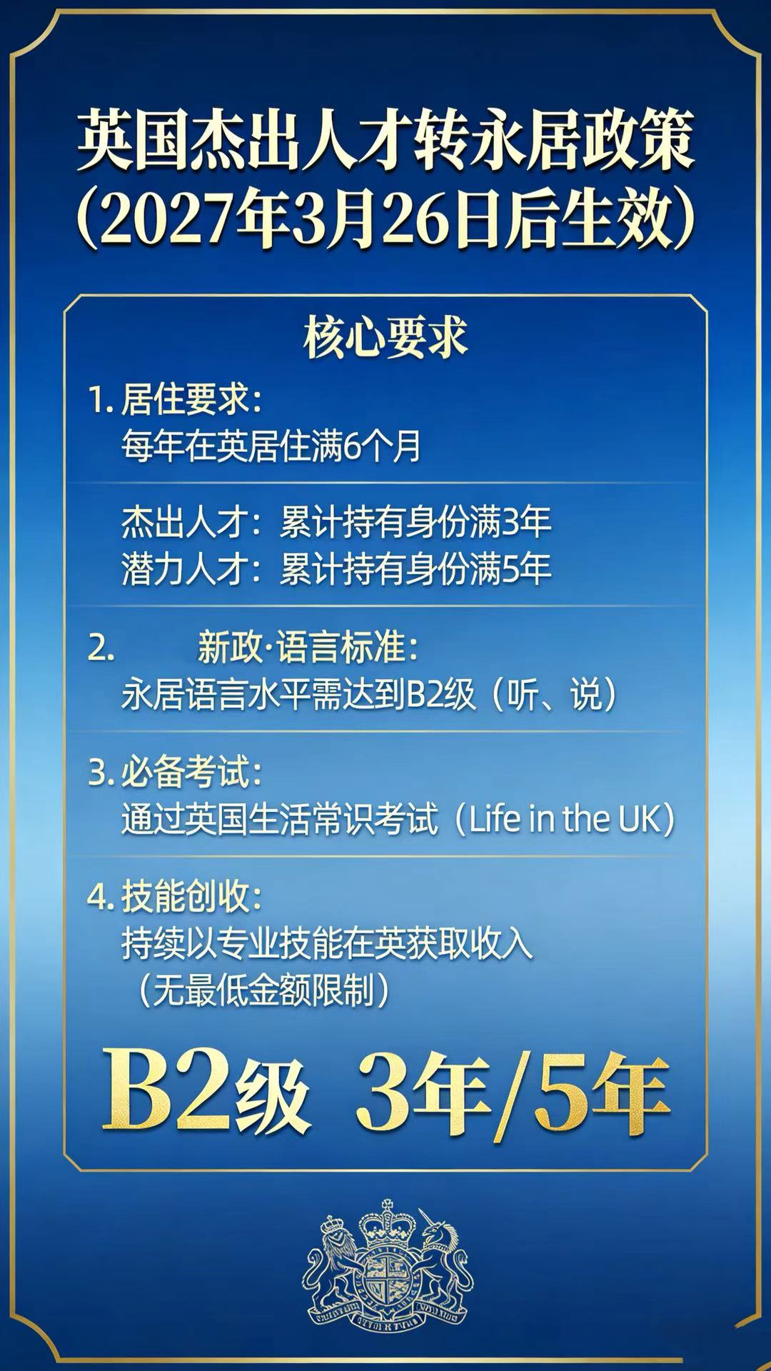 2027年3月26日之后:所有永居申请英语要求统一提高至CEFRB2水平(对应雅思5.5分)。