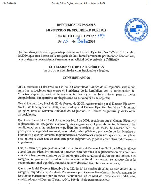 新的法案在 2020 年第 722 号行政令基础上进行了修改和补充,由于该项目已对国家和经济作出重要贡献的背景下,在永居身份下正式设立合格投资者永久居留许可(ResidentePermanente,en calidad de Inversionista Calificado) 的分支。