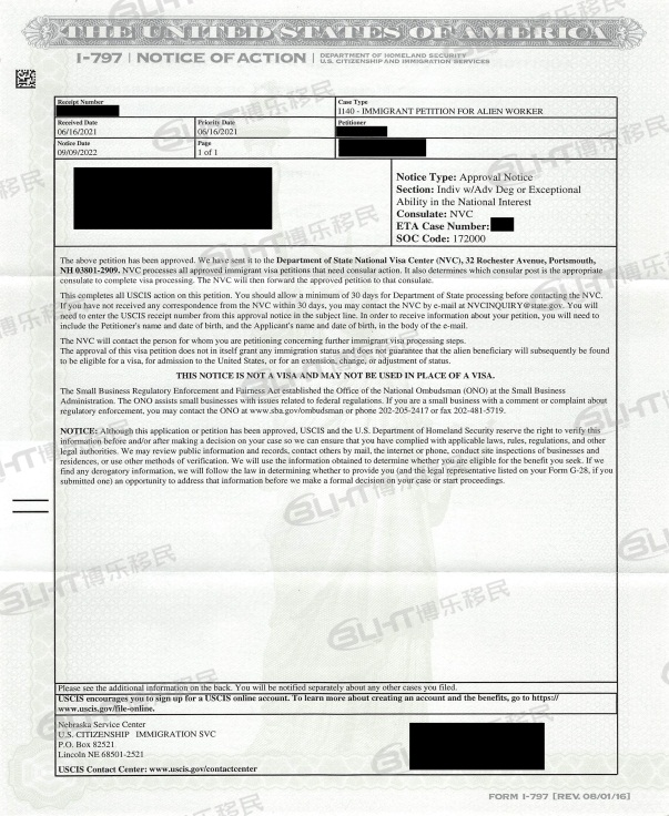 一个个持续获批是我们送给客户最 好的礼物。博乐移民依托丰富的海外资源,凭借多年丰富的办理经验,致力于服务每一个客户。从前期对客户全方位评估定位,制定个性化方案,到后期准备客户申请材料,递交移民申请并与移民局实时沟通保 证审理顺利,成功帮助客户拿到绿卡,实现移民梦想。