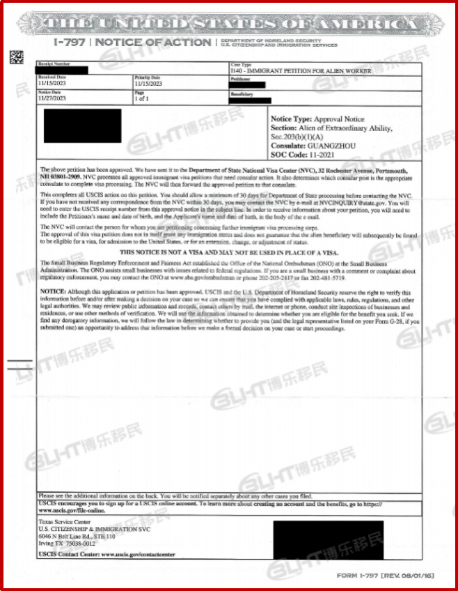 美国移民局又来给大家送喜报了!美国EB-1A项目客户F女士成功获得I-140移民申请批准!