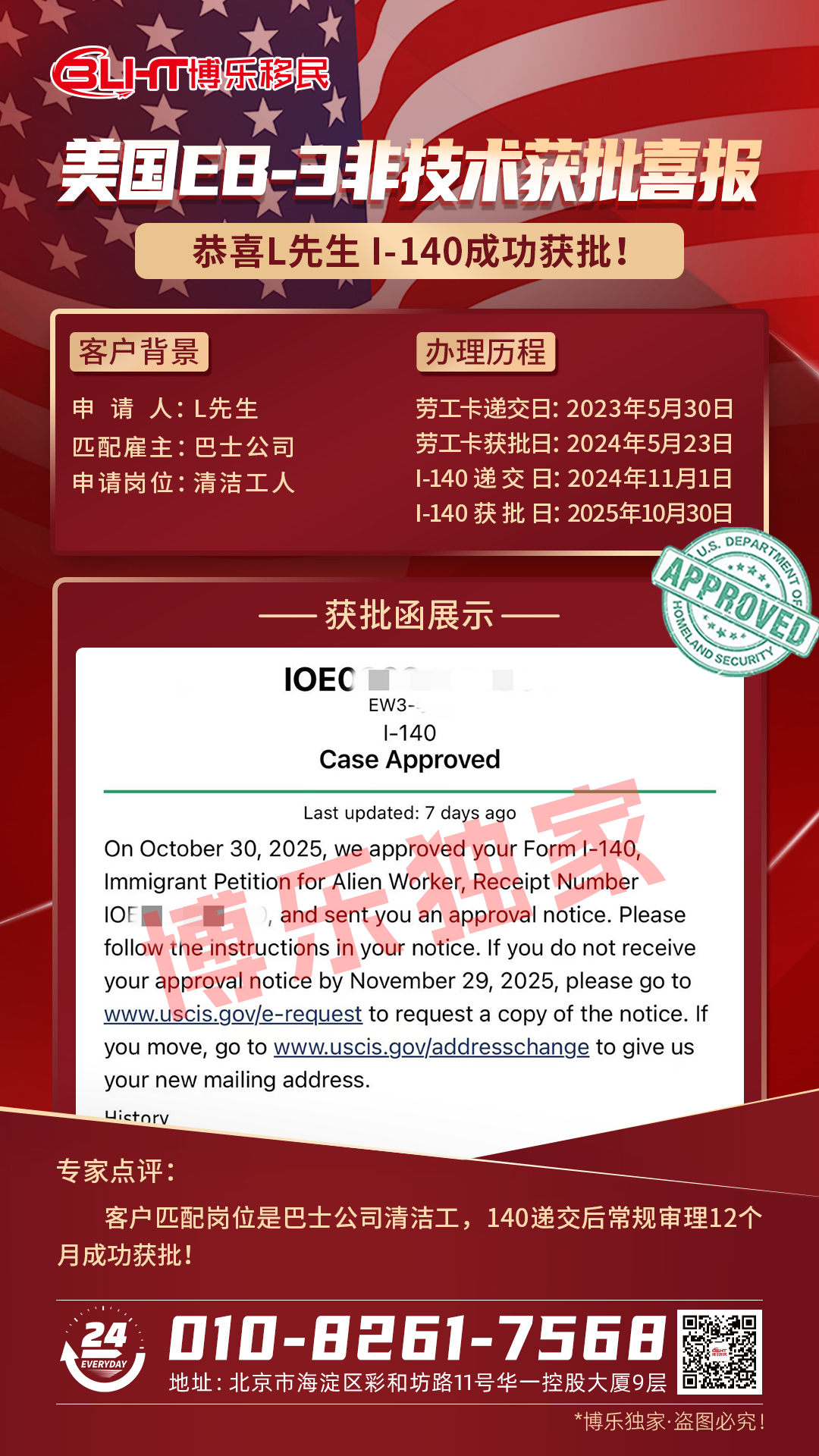 喜报!喜报!恭喜L先生I-140获批!他将凭巴士公司offer,为孩子清扫出一条赴美大道。这份“不起眼”的工作,是他给家庭教育 * 的投资。