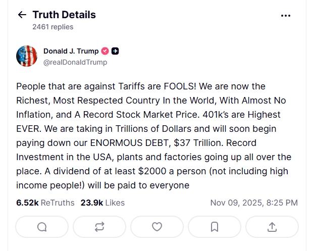 美国总统特朗普11月9日再度宣称,将用关税收入为民众发钱,这次他提出了一个具体数字。