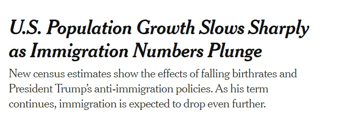 据纽约时报1月28日报道 美国人口普查局周二发布的 * 数据显示,美国去年人口增长率跌创历史新低。在总统川普强硬的反移民政策下,移民数较前一年暴跌超50%,而出生率也延续了近20年的下滑趋势。