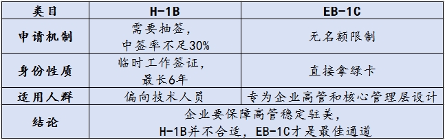 结论:企业要保障高管稳定驻美,H-1B并不合适,EB-1C才是 * 通道。