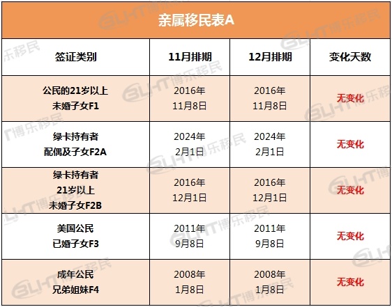 亲属移民表A无变化,表B仅F2A小幅前进31天,其余保持不变。