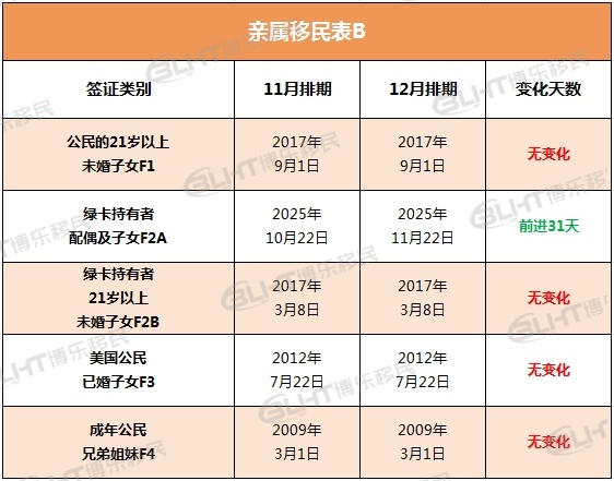 绿卡持有者配偶及子女F2A:表A无变化,停留在2024年2月1日;表B前进31天,来到2025年11月22日。