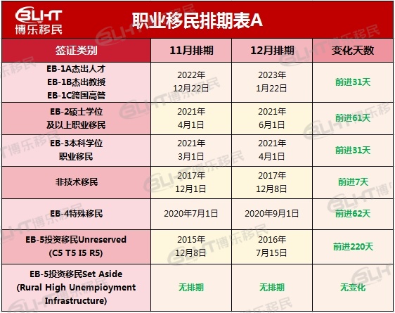 相较于上月的排期,12月移民排期整体稳中向好。尤其是职业移民表A,真是令人喜出望外。