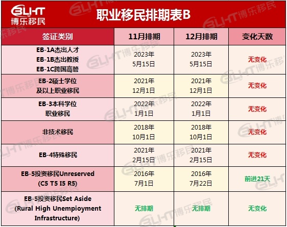 EB-1(杰出人才、跨国高管等):表A前进31天,来到2023年12月22日;表B无变化,为2023年5月15日。