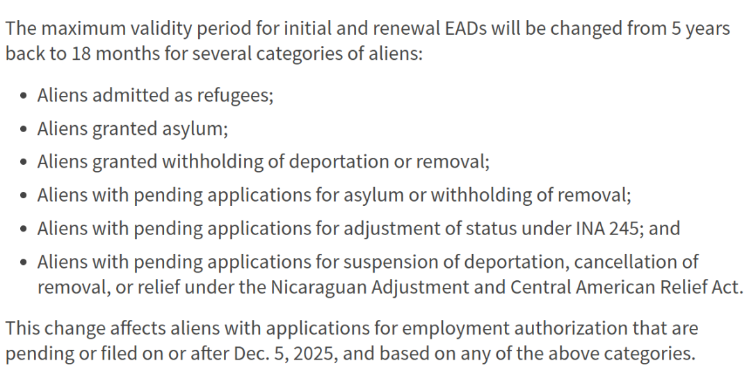12月4日,美国移民局(USCIS)在官网更新政策手册:针对庇护、难民、暂缓遣返等类别的工作许可(EAD),有效期将从5年缩短到18个月,以确保对外国人进行适当的审查和筛查。