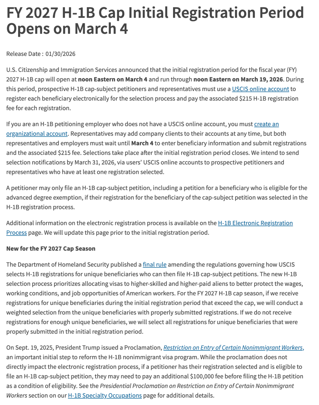 美国移民局(USCIS) * 公告:2027财年H-1B抽签注册时间已正式公布——H-1B申请大战正式拉开序幕!