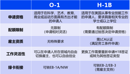 O-1工作签证就是为了吸引优秀人才而设立的一种非移民签证类型。它无抽签、无限额、无学历硬性要求,可无限次延期,并可直接衔接EB-1A/NIW 绿卡通道。是全球人才的赴美快车道,锁定美国绿卡的黄金跳板!对比H-1B,O-1优势更明显: