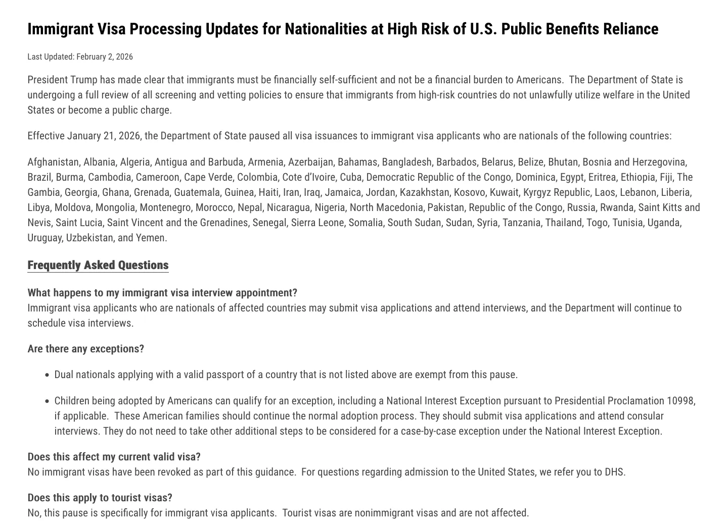自2026年1月21日起,美国国务院暂停向包括中国在内、其移民群体被认定为较高比例依赖美国公共福利、损害美国纳税人利益的国家国民签发移民签证。