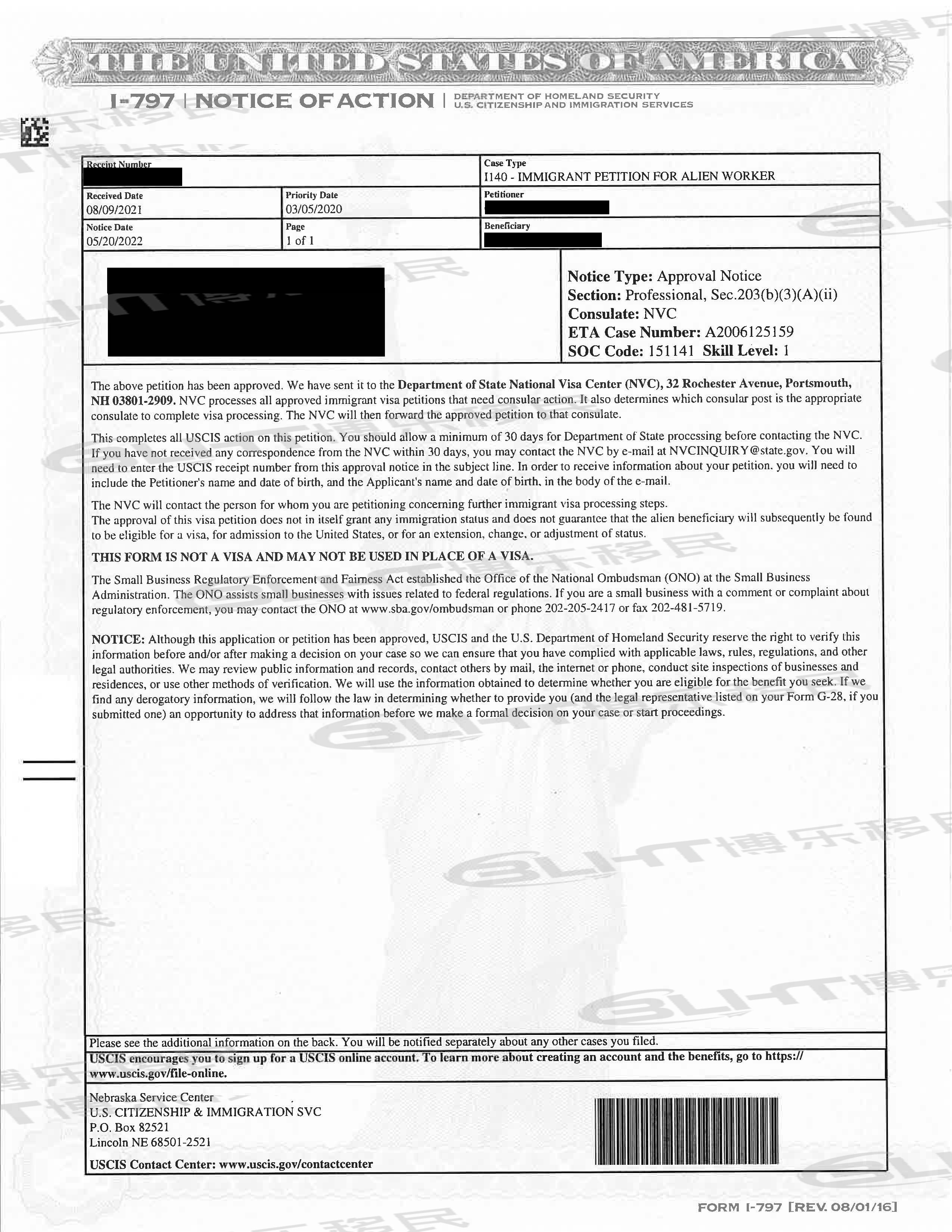 这位客人的申请背景要和大家着重分享一下,客户在美国拿到硕士文凭后很幸运的在当地找到工作,且雇主公司也为其担保了EB-3移民申请,但是2次打广告都遇到了美国当地人面试而未能申请成功,客户又换了一家愿意为其担保身份的雇主公司,好不容易等到了劳工卡获批,又因自身原因回国雇主终止了后续的140申请,但是客人还是一心向往美国定居,于是找到我们再一次办理移民申请,就在本月终于拿到了140获批的好结果!恭喜恭喜!