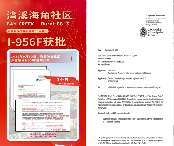 湾溪海⻆的 I-956F“项目范本”已获得美国移民局批准。项目的架构、乡村TEA资格、和就业创造模型都符合EB-5计划的要求。I-526E可直接开始审理, 并享20%签证预留及优先审批政策。