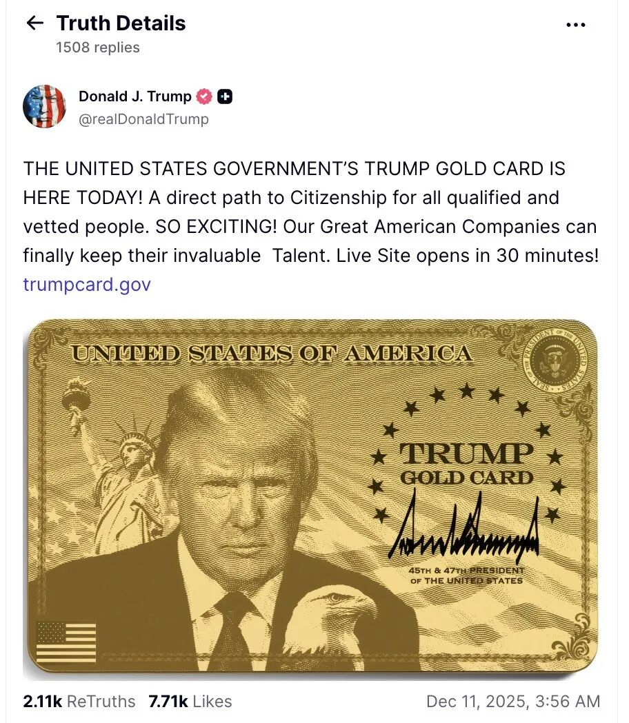美国总统特朗普当地时间12月10日宣布,美国政府当天起正式接受“特朗普黄金卡”签证计划的申请。
